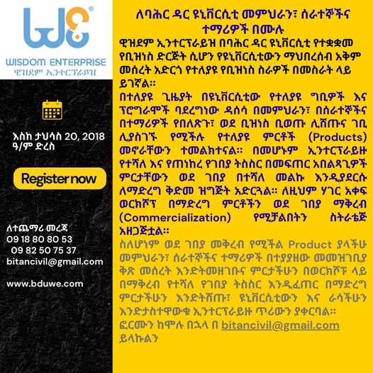 Submitted by TANA on Wed, 12/17/2025 - 12:25 Product Developers Registration - Wisdom Enterpriseየመመዝገቢያ ቅጹን ለማግኘትhttps://t.me/BDUcommunication/5835 photo